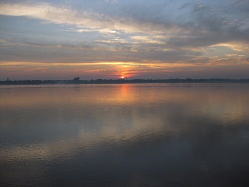 翌朝、6時に目が覚めて、ホテルの レストランに行く。 すでに起きている早起き外人がいて、 湖畔をどこか物憂げにみつめている。 太陽は今まさにのぼらんとしていて、 僕はその景色に息をのむ。 メコン川の朝焼けと夕焼けは、いつみても まるで初めて朝日を…